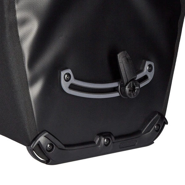 Aufhängung für Gepäckträger mit einem Rohrdurchmesser von 8 bis 16 mm. Die beiden oberen Haken lassen sich werkzeugfrei auf der aus einem Stück gefertigten Schiene verschieben und durch Anheben des Tragegriffs öffnen. Der untere Arretierungshaken auf einer halbelliptischen Schiene ist ebenfalls individuell anpassbar und werkzeugfrei in 15-Grad-Schritten drehbar. Ein Scheuerschutz im unteren Bereich der Taschen und an der Auflagefläche des Gepäckträgers beugt Abrieb vor.