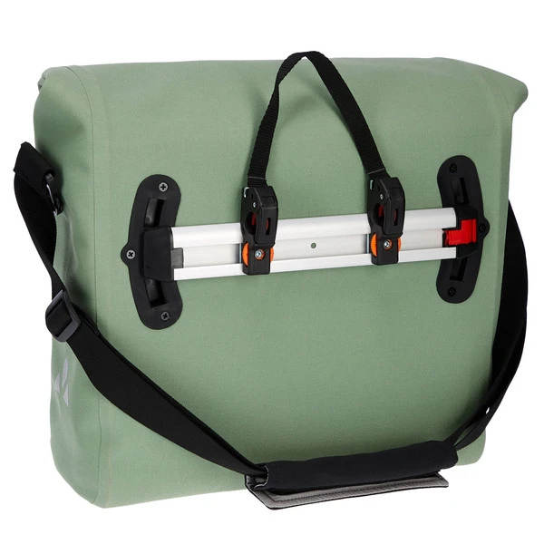 Dank des Befestigungssystems Plug and Ride kannst du die obere Führungsschiene an deiner Vaude-Radtasche ganz einfach verstellen. Die schräge Befestigung verhindert, dass du beim Radeln mit den Fersen an die Tasche kommst. Nutzt du die Radtasche als Umhängetasche, verstaust du die Schiene einfach in der Tasche oder schließt sie über den QMR 2.0 am Gepäckträger ab.